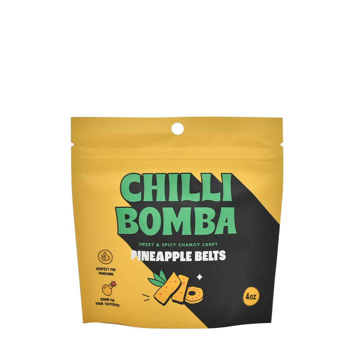 Tropical candy with a spicy twist. Spicy Pineapple Belts bring sunshine, and the heat. These chewy pineapple flavored strips are coated in sweet, sour, and chili chamoy blend, delivering an explosion of tropical flavor with each bite.