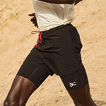 The layered trail short unites our recycled half tights and 5” training shorts, and features a concealed phone pocket under the outer shell of the shorts, a secure rear technical zip pocket, a discrete key pocket sewn into the waistline, and substantial drawcords for a secure and customizable fit.