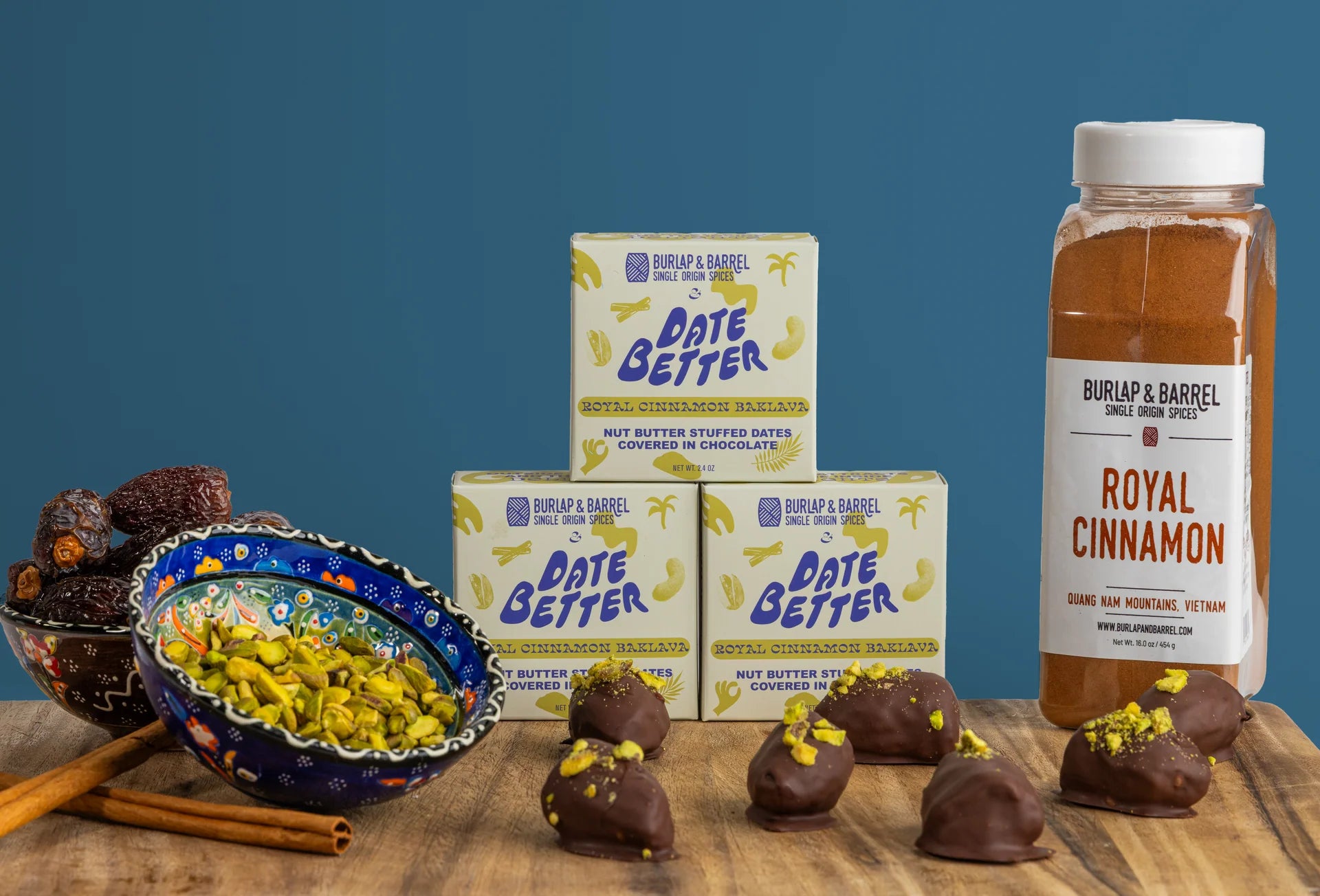 Buttery pistachios, cashews, and almonds tucked into sweet Medjool dates, covered in rich chocolate, and kissed with Burlap & Barrel’s Royal Cinnamon- an heirloom Vietnamese variety known for its bold warmth and natural sweetness. It’s warm, nutty, chocolatey, and just a little fancy—basically baklava vibes without the pastry commitment.