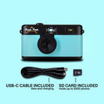A screen free digital camera. Designed to help you capture the moment without missing it, Camp Snap give you the nostalgic joy of film style photography minus the film and waste. With its durable build, rechargeable battery, and included SD memory card that stores up to 2,000 photos, it's ready for every adventure.