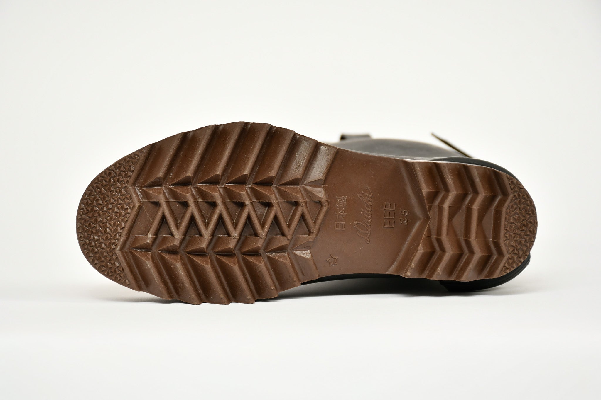 These unique rubber boots were designed by Daiichi Rubber with comfort, style, and durability in mind. Each aspect of the boot is designed with extreme care and consideration. The outer sole has a ripple design for a deep notch and grip. This allows the boot to be flexible and bendable, while still maintaining a firm grip on even the most slippery of surfaces. The pull on design of the boots is inspired by American agriculture, and the pull strap helps the wearer pull on or off the boots. Perhaps most uniquely of all, these boots were manufactured with "direct vulcanization". This vulcanization method completely seals the boot, ensuring that your feet remain warm and dry. Finally, these boots can be folded for easy storage during dryer months!