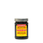 These are candied cherries soaked in Luxardo marasca cherry syrup. The percentage of marasca cherries in jars and tins is about 50% and so is the percentage of syrup. No thickening agents of any type and no preservatives are used and the dark red color is all natural.