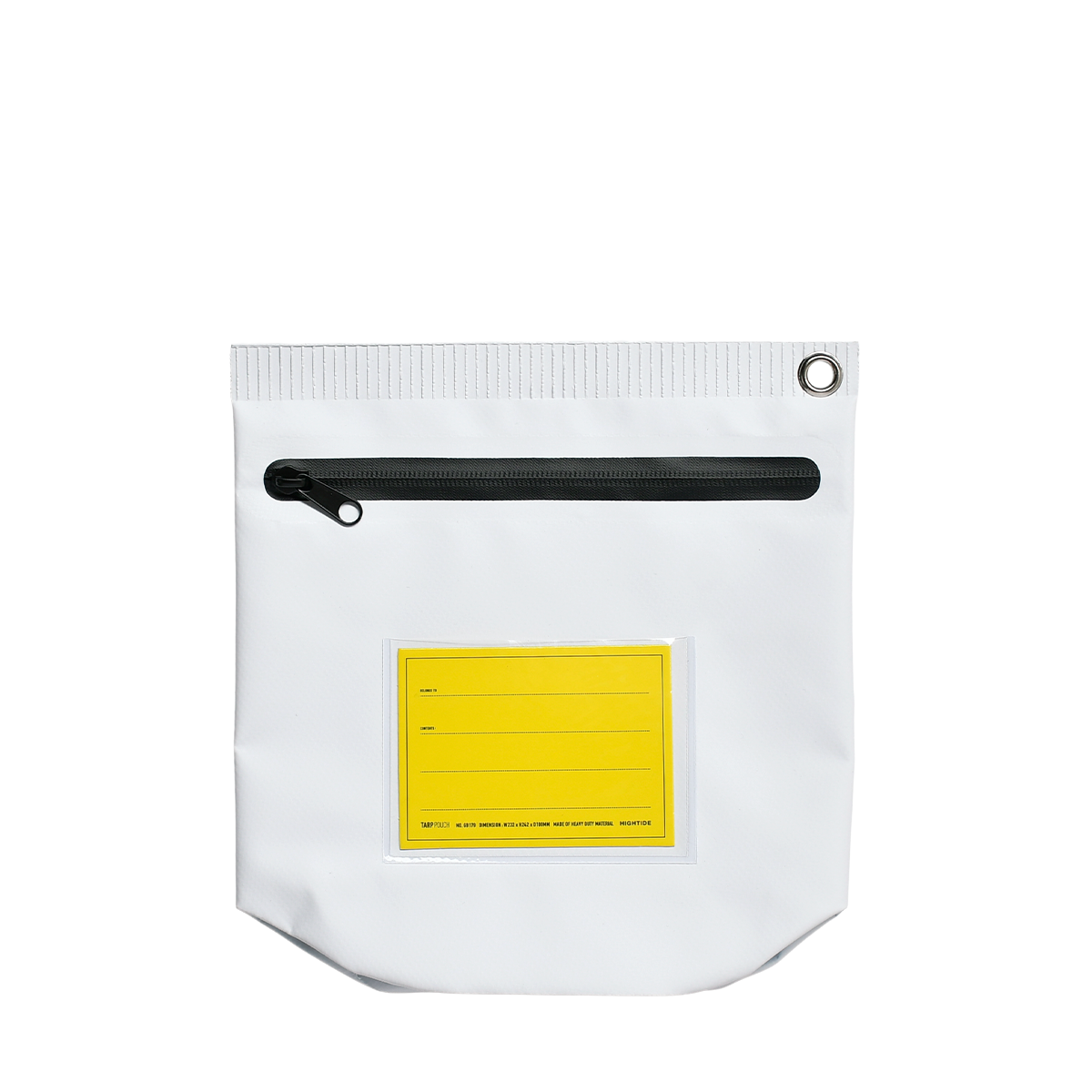 A gusseted water-resistant zippered pouch made of PVC tarpaulin with a label insert by Hightide.
